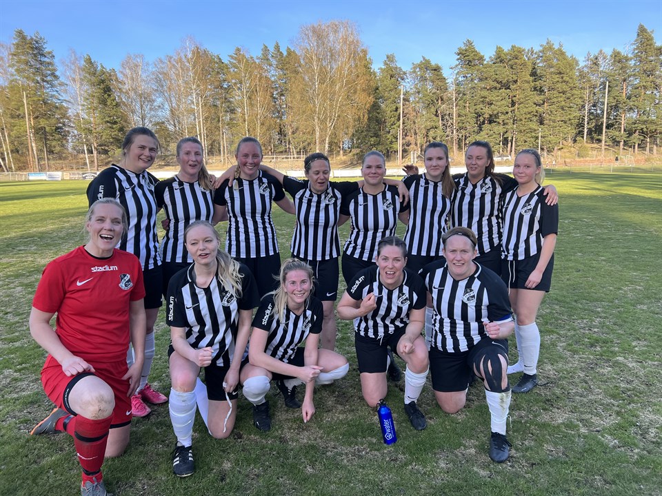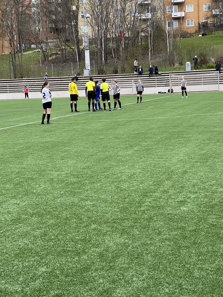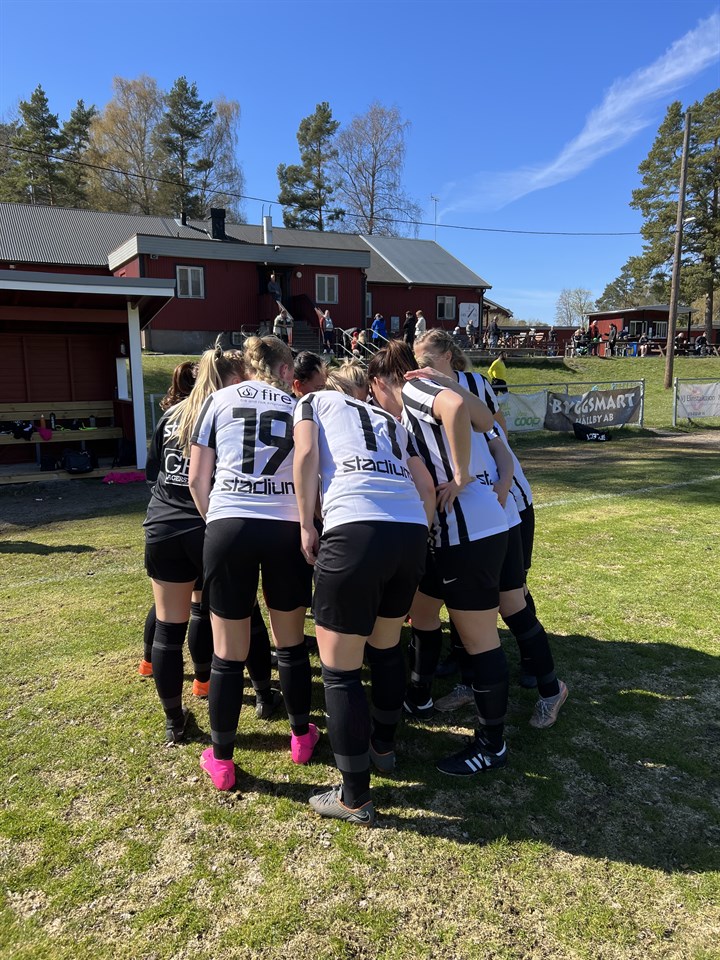 Vi får återigen stuva om i laget då flera spelare är borta pga sjukdom, skador och jobb. Maria gör comeback i A-laget men nu som utespelare. Aspudden börjar i ett högt tempo och söker långa bollar på deras snabba kantspelare och vi har svårt att hitta rätt i våra positioner och slarvar lite i våra uppspel. Aspudden tar ledningen med 1-0 20 minuter in i matchen när vi inte får undan bollen och de kommer till avslut utanför straffområdet. Vi jobbar oss in i matchen mer och mer och har några farliga lägen innan vi kvitterar till 1-1 i den 37 minuten när Linnea hittar in med bollen till Amilia som slår dit bollen på volley. I inledningen av den andra halvleken kommer vi upp mer i plan, tar över mer av spelet och får press på Aspuddens försvar. Aspuddens målvakt gör många bra räddningar och Maria har ett avslut i ribban. Lisa får ett bra läge och är riktigt nära att lyfta bollen över målisen men hon får fingrarna på den och bollen går ut till hörna. Aspudden är farliga på sina omställningar och skapar även de några lägen att avgöra. Med 10 minuter kvar av matchen får vi inte undan bollen ur eget straffområde och Aspudden gör 2-1 på en retur. Vi krigar på bra, lyfter oss i andra halvlek och tycker nog att vi är värda 1 poäng idag. Nya tag till nästa helg då vi äntligen får göra premiär hemma på Skogsvallen när vi tar emot Stuvsta lördag 6 maj 15:00.