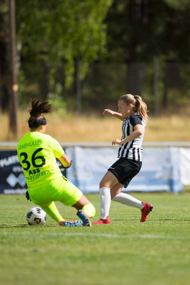 Det blev en tuff och jämn match i värmen hemma på Skogsvallen mot serieledarna Bele. Matchen slutar med en uddamålsförlust 0-1 efter 0-0 i halvtid. Det skapas inte så mycket målchanser åt något håll men i den 58 minuten får Beles forward på en bra träff strax utanför straffområdet och de tar ledningen med 0-1. Vi har en farlig hörna där Beles målvakt får sträcka ut ordentligt och även ett friläge där vi har möjlighet att kvittera men bollen vill inte dit. Hela laget står för en bra insats och vi tycker att vi var värda en poäng i värmen. Hanna Wilkens, tidigare Kvicksunds SK, gör debut i A-laget. Foto: Erik Vässmar