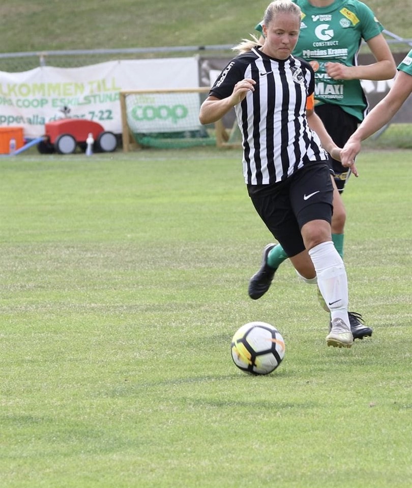 Efter fem matcher utan seger i division 2 mellersta Svealand tog vi idag äntligen våra första tre poäng. Vinst på bortaplan mot serietvåan Vaksala, med 0-1 efter 0-1 i halvtid. - Äntligen en seger till våra tjejer. Efter en gedigen match, med en härlig inställning i nittio minuter. Vaksala kanske hade lite mer bollinnehav, men segern är definitivt inte orättvis på något sätt. Hela laget förtjänar en ros med lite extra plus till Josefin Eriksson i målet, kommenterade Hällbybrunns tränare Tony Bird efter matchen. Hällbybrunn tog ett tidigt grepp om matchen och målet gjordes alltså under första halvlek efter ett mönsteranfall där JB spelar fram Ellis som trycker dit bollen. Nästa match spelas hemma på Skogsvallen lördag 12 september 15.00 när Östervåla kommer på besök. Foto av Elsa Lundgren: Ellis, målskytt i dagens match